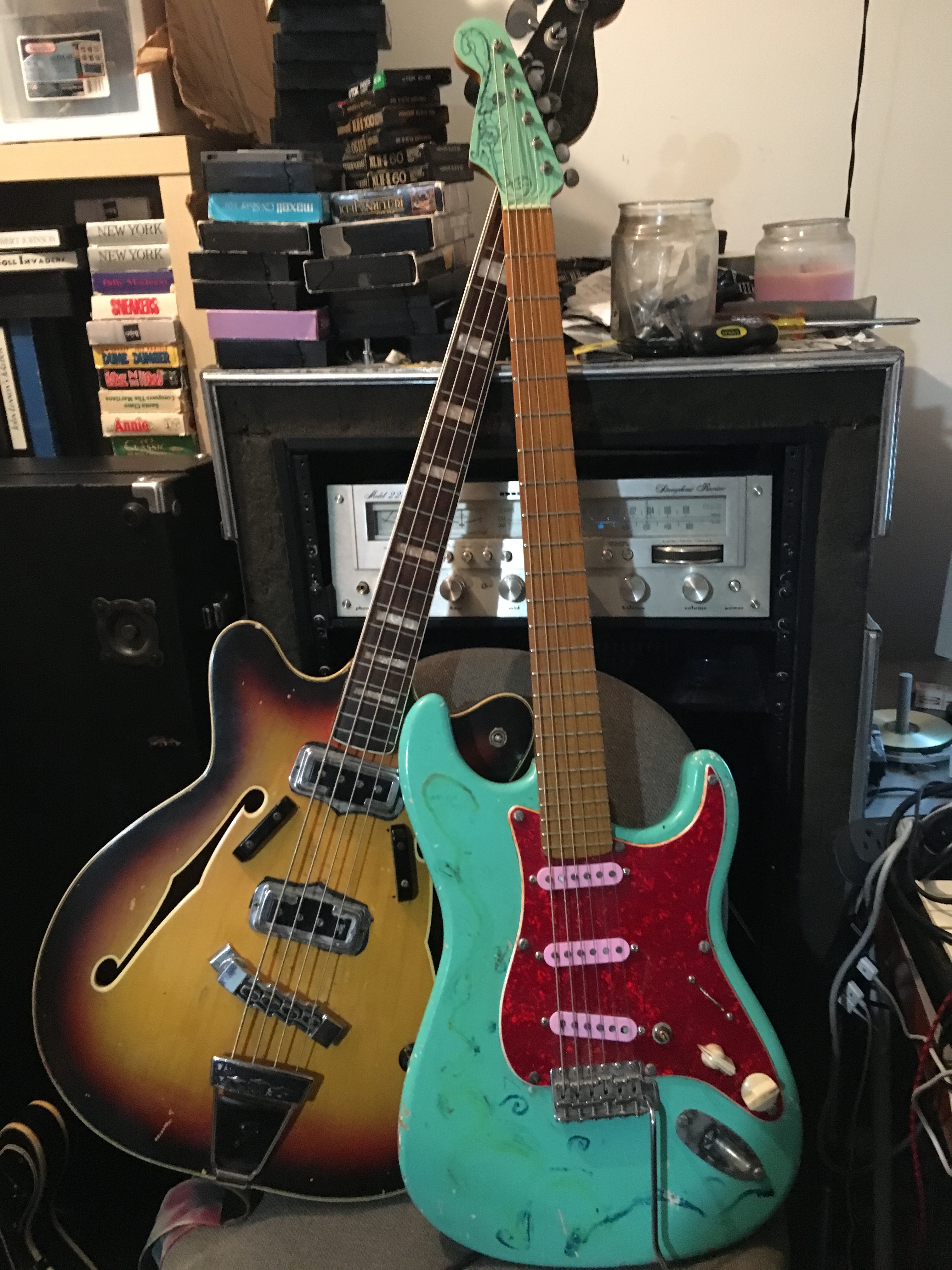 My bass is a 1968 Fender Corando II that I picked up in 2000. A friend helped me build a guitar buy buying all the pieces seperately, and it is essentially a 1959 baritone strat. I play both through a 1968 Dual Showman.