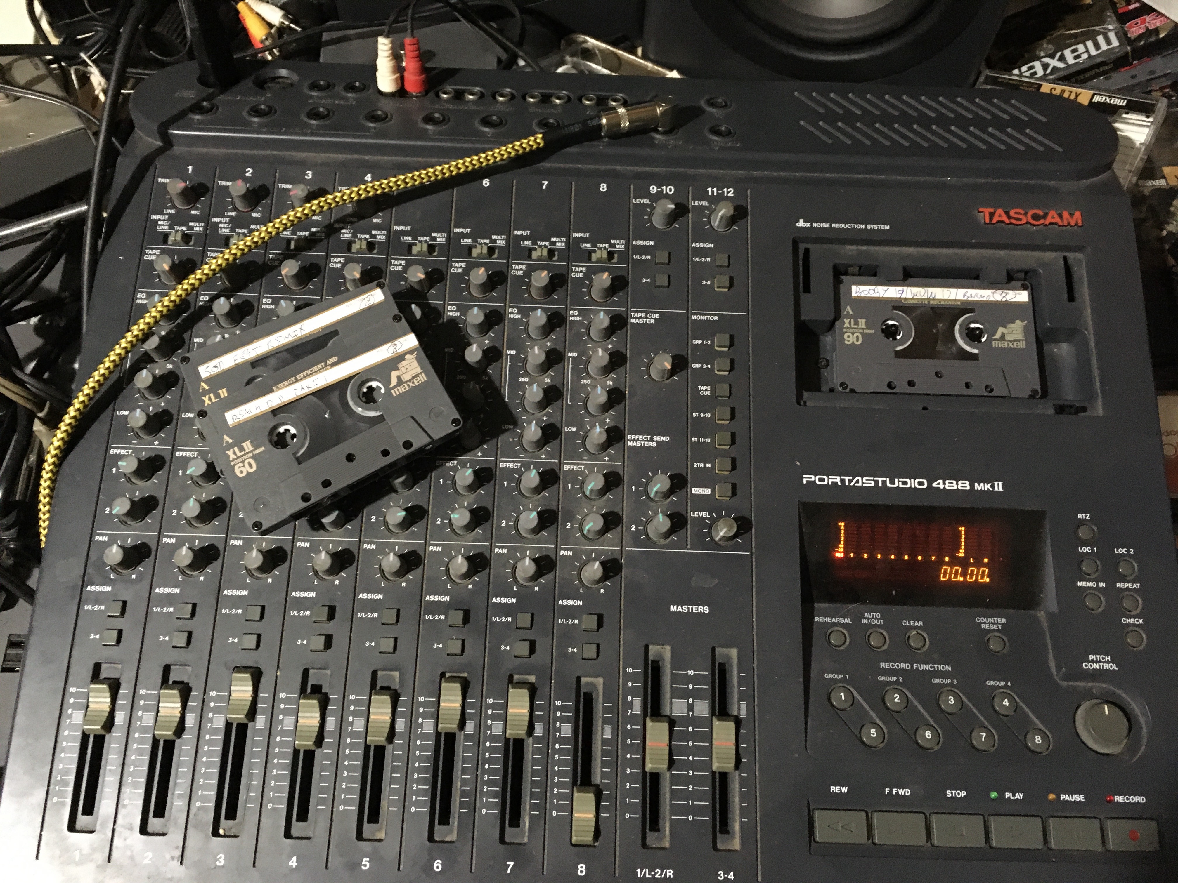 All voice and instrument sounds are projected into the room, where they are mutated by air, walls, and common basement pollutants, picked up by a an RCA 44 microphone, amplified by an Ampex MX-10, and tracked to Maxell XLII tape on a Tascam 488 MkII 8-track cassette recorder (unles it's broken, in which case a Tascam Porta 02 is used). Songs are then mixed to Maxell II-S, and may be moved to open reel later if my deck gets fixed. All recordings are mono for maximum compatibility, and I was surprised by how many people's sound systems are missing a channel when I released albums with hard pans. All digitized versions are copied from the XLII-S.